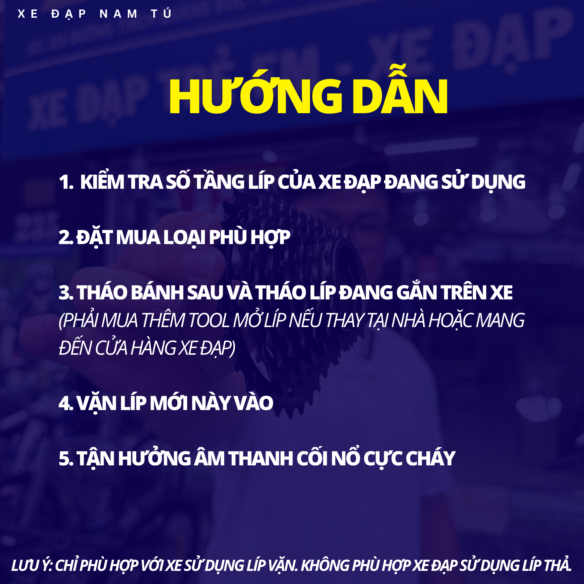 Kiểm tra líp đang sử dụng là vặn hay thả. Và đếm số tầng líp trên xe đạp bạn đang sử dụng (7 hay 8 tầng). XEM VIDEO HƯỚNG DẪN KIỂM TRA