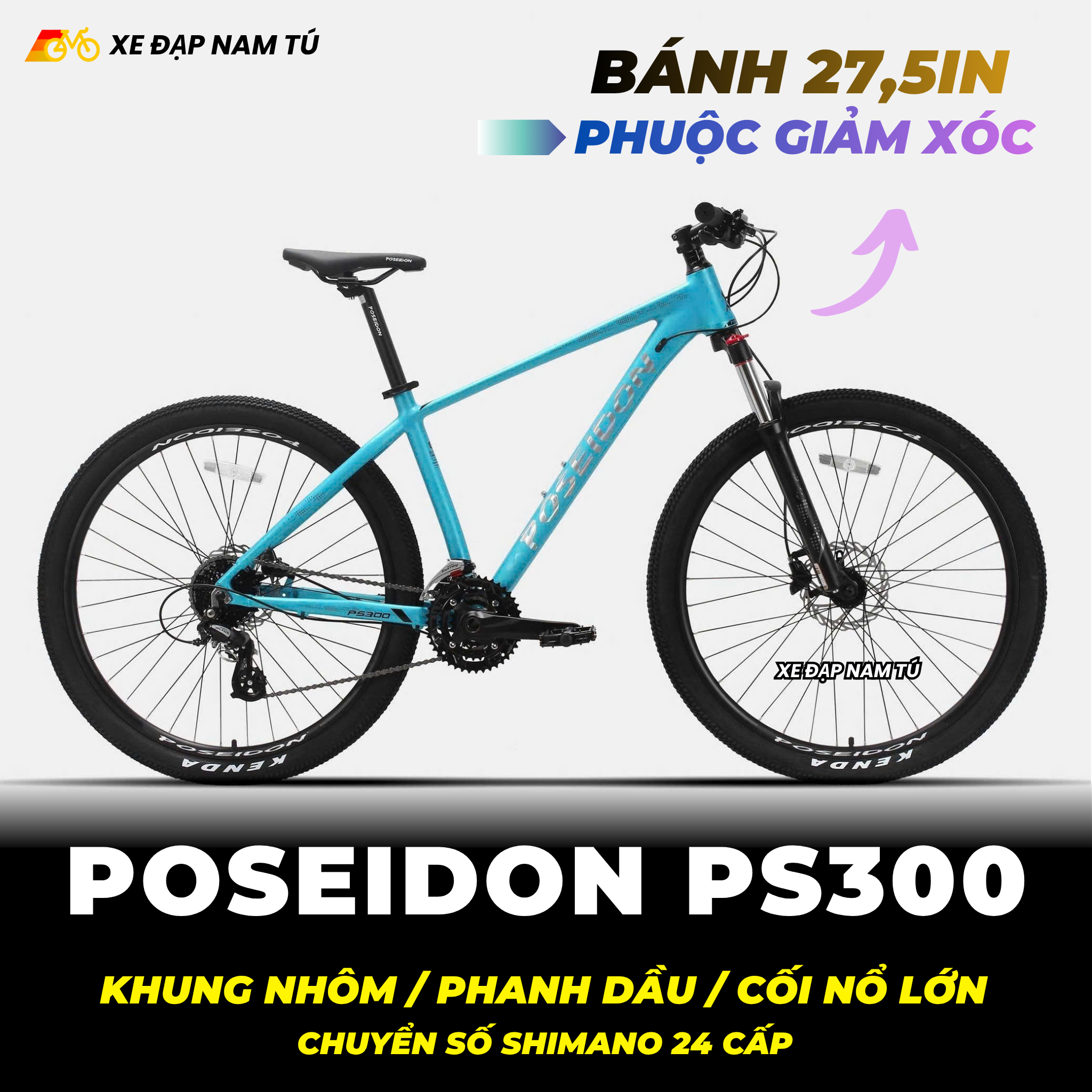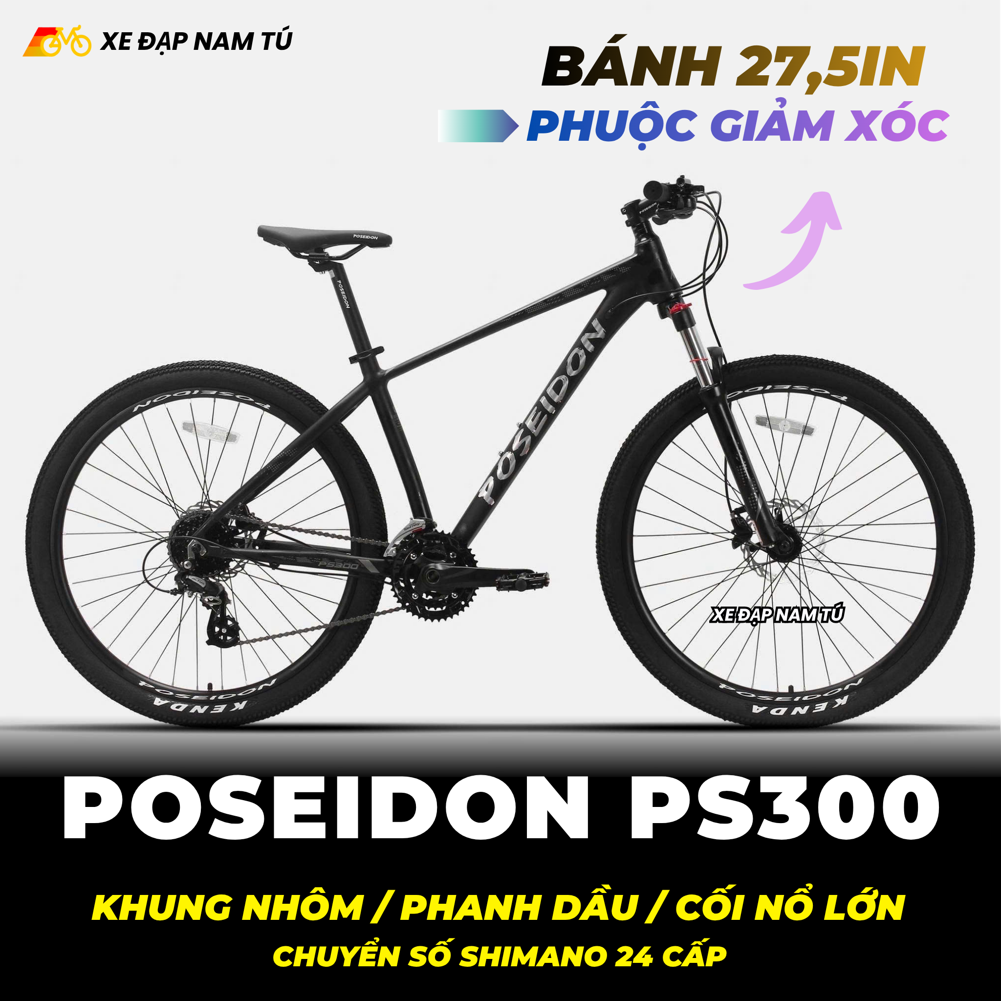 XE ĐẠP MTB POSEIDON PS300 BÁNH 27.5IN, KHUNG NHÔM, GROUP SHIMANO, PHANH DẦU, CỐI NỔ LỚN ARC